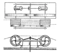 Another attempt to reduce the frequency of chain breakages and the movement of the chain in the river came from France and was introduced in November 1892 on the Lower Seine near Paris.[19] Its inventor, de Bovet, developed a technique to increase the friction on the transmission drum by magnetic force. Here, too, the chain was only wound three-quarters of the way around the traction drum. The engagement of the chain on the traction drum was achieved by magnetic force created by electromagnets that were built into it. The electric current needed for this was generated by its own engine and a ca. 3 HP dynamo.[18]