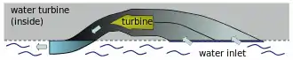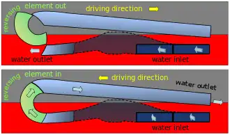 Water was sucked in through two rectangular intakes in the side of the chain steamer's hull. It then flowed through the turbine inside the hull. The turbine accelerated the water and forced it through the rear-facing outlets in the side of the hull. The outflowing jets of water propelled the boat forwards (upper diagram of the elevation view). To reverse the direction of travel, the reversing element was swung around so that water was forced in the opposite direction (lower diagram of the elevation view). The pump direction of the turbine was always the same, regardless.[23][24]