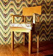 One of the basic pieces of furniture, a chair is a type of seat. Its primary features are two pieces of a durable material, attached as back and seat to one another at a 90° or slightly greater angle, with usually the four corners of the horizontal seat attached in turn to four legs—or other parts of the seat's underside attached to three legs or to a shaft about which a four-arm turnstile on rollers can turn—strong enough to support the weight of a person who sits on the seat (usually wide and broad enough to hold the lower body from the buttocks almost to the knees) and leans against the vertical back (usually high and wide enough to support the back to the shoulder blades). The legs are typically high enough for the seated person's thighs and knees to form a 90° or lesser angle.[1][2] Used in a number of rooms in homes (e.g. in living rooms, dining rooms, and dens), in schools and offices (with desks), and in various other workplaces, chairs may be made of wood, metal, or synthetic materials, and either the seat alone or the entire chair may be padded or upholstered in various colors and fabrics.
