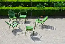 Chairs vary in design. An armchair has armrests fixed to the seat;[3] a recliner is upholstered and under its seat is a mechanism that allows one to lower the chair's back and raise into place a fold-out footrest;[4] a rocking chair has legs fixed to two long curved slats; and a wheelchair has wheels fixed to an axis under the seat.[5]