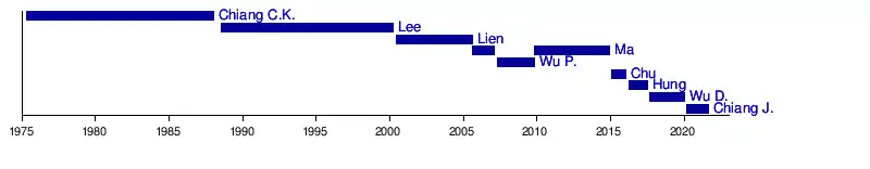 The Chairman of the Kuomintang is the leader of the Kuomintang party of the Republic of China. The position has previously been titled as President (1912–1914), Premier (1919–1925), Chairman of the Central Executive Committee (1925–1938), Director-General (1938–1975), and Chairman (from 1975). The post is currently held on by Johnny Chiang, who assumed the post on 9 March 2020, following an election to replace Wu Den-yih, who resigned the position. The Chairman is now directly elected by party members for a term of four years, and may be re-elected for a second term.