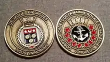 Challenge coins are also exchanged outside the military. NASCAR,[31] the NFL, cadets of the Civil Air Patrol,[32] Eagle Scouts and World Series of Poker all have their own challenge coins.[33] They are also becoming popular with police departments, fire departments and fraternal organizations. In 2007, the Utah Symphony and Opera gave challenge coins to all of its staff and musicians, making it the first symphony organization in America to do so. Franklin Public School in Ontario has a coin that is given to graduates, featuring its mascot 'Frankie'.[34] Many non-profits, especially those with connections to the military, give challenge coins to donors to acknowledge their support of the organization.[35][36] The FBI's Crisis Response unit was the first unit in the FBI to issue coins to unit members in late 1980s.