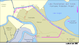 On August 29, 2005, a 25-foot (7.6 m) storm surge from Hurricane Katrina overflowed through the Mississippi River–Gulf Outlet Canal (commonly known as MRGO) — a commercial channel dug by the United States Army Corps of Engineers in the 1960s — and flooded most of the town, with waters as high as 14 to 15 feet (4.9 m)[7] in some places. As a result, Chalmette was extensively swamped and destroyed. A majority of the population evacuated shortly before the storm hit, but there was still significant loss of life.