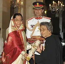 Homai Vyarawalla (right), winner of the 1998 Chameli Devi Jain Award, receiving the Padma Vibhushan from the President of India in 2011.