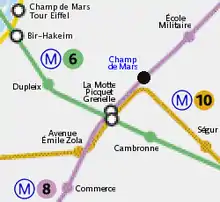 Champ de Mars is a ghost station along line 8 of the Paris Métro, between the stations la Motte-Picquet - Grenelle and École Militaire. It is situated in the 7th arrondissement of Paris, to the southwest of the public garden called Champ de Mars.