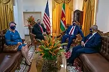 On 26 May 2020, the preliminary results of the 2020 Surinamese general election showed that the VHP was the largest party, and that Chan Santokhi was the most likely candidate to become the ninth President of Suriname.[20] On 30 May, Chan Santokhi announced his candidacy for President of Suriname.[21] On 29 June, the VHP nominated Chan Santokhi as their candidate for the Presidency.[22] On 7 July, the coalition nominated Chan Santokhi as President of the Suriname and Ronnie Brunswijk as vice-president.[23] No other candidates had been nominated on 8 July 2020, 15:00 (UTC−3), and on 13 July Santokhi was elected as president by acclamation in an uncontested election.[24][25][26] He was inaugurated on 16 July on the Onafhankelijkheidsplein in Paramaribo in ceremony without public due to the COVID-19 pandemic.[27][1] He belongs to a Hindu family of Indian origin.He surprised the world by reciting Sanskrit shloks and mantras in his oath ceremony.[28] Santokhi's inauguration was also blessed by several Christian religious leaders.[29][30]