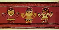 In type of fabric used include llama wool, cotton, chiffon, and feathers.[2] Their technique involved were decorated open weave, brocade, embroidery, and painting.[2] Brushes were used to paint anthropomorphic, zoomorphic, geometric and other creative designs directly on the canvases. The Chancay are known for the quality of their painted tapestries. The typically geometric designs also included drawings of plants, animals such as fish, cats, birds, monkeys and dogs (most notably the hairless Peruvian dog[4]) as well as human figures.[3] Some of the human fiber sculptures are elaborate and include such scenes as a mother teaching her daughter to weave on a backstrap loom.[5] Birds and deities wearing crescent-like headdresses were one of the more common decorative features.[1] They produced a variety of goods such as clothing, bags, and funeral masks.[2]