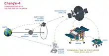 Direct communication with Earth is impossible on the far side of the Moon, since transmissions are blocked by the Moon. Communications must go through a communications relay satellite, which is placed at a location that has a clear view of both the landing site and the Earth. As part of the Lunar Exploration Program, the China National Space Administration (CNSA) launched the Queqiao (Chinese: 鹊桥; pinyin: Quèqiáo; lit. 'Magpie Bridge') relay satellite on 20 May 2018 to a halo orbit around the Earth–Moon L2 point.[30][31][32] The relay satellite is based on the Chang'e 2 design,[33] has a mass of 425 kg (937 lb), and it uses a 4.2 m (14 ft) antenna to receive X band signals from the lander and rover, and relay them to Earth control on the S band.[34]