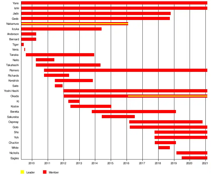 Since its founding, Chaos has added several new members, including Kazuchika Okada, who has held the IWGP Heavyweight Championship five times and won the G1 Climax tournament in 2012 and 2014, as well as the 2013 and 2019 New Japan Cup. Okada became the leader of Chaos after Nakamura's departure from New Japan and succeeded Hiroshi Tanahashi as the promotion's "ace," or top star. Rocky Romero, another member of Chaos, won the IWGP Junior Heavyweight Tag Team Championship a record eight times.