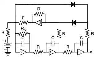 In the above circuit, all resistors are of equal value, except , and all capacitors are of equal size. The dominant frequency is . The output of op amp 0 will correspond to the x variable, the output of 1 corresponds to the first derivative of x and the output of 2 corresponds to the second derivative.