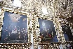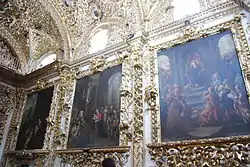 The Chapel of the Virgen del Rosario is the chapel attached to the Church of Santo Domingo in the city of Puebla, Puebla, Mexico. Work of the 17th century, summit of the New Spanish Baroque, was described in its time as the Eighth Wonder of the World[1] by Friar Diego de Gorozpe, in a print of 1690,[2][3] regarded like this for a long time in the New Spain,[4] as well as La Casa de Oro (The Golden House) and Domus Aurea.[4] It is one of the most prominent examples of the New Spanish Baroque and one of the greatest artistic-religious achievements in Mexico. It is a chapel full of symbolisms, where each element represents something related to the Catholicism and Dominican Order beliefs.[4] It is located on pedestrian avenue 5 de Mayo number 407.