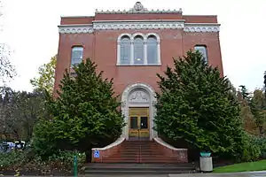 The building is rectangular in plan. The main elevation is on the West side of the building. Construction of the building is concrete with a brick façade. There are steel windows. The facing of the building is done in terra cotta and brick. The style of the building is Mediterranean and is in keeping with many of the Lawrence buildings on the University of Oregon campus. The building has undergone some structural changes over time. In 1966, the façade was altered to change the north door into a window. In 1981 partitions were added to the third floor to make room for offices. Chapman Hall was the first fireproof building to be constructed at the University of Oregon.[3] It would become the standard for the rest of the campus construction. Most of the interior of the building is still intact, including woodwork and a fireplace with ceramic tiles.[4] In 1942 a mural was added to room 223. It was a Works Progress Administration mural done by E.R Scott as his thesis work. The mural is done in the New Deal Social Realist style.[5] It depicts some famous figures such as Thomas Paine, and Thomas Jefferson. The building has decorative elements of red and white terra cotta tiles, Roman arches, basket weave brick pattern below the windows. Chapman Hall would be the last use of terra cotta at the University of Oregon.