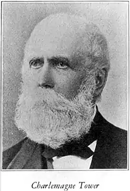 Charlemagne Tower, (April 18, 1809 – July 25, 1889[1]) was an American lawyer and businessman active in acquiring land in the Schuylkill Valley in Pennsylvania and serving as an officer for coal and railroad companies. He organized and led a company of Union soldiers from Pottsville in a 3-month enlistment during the American Civil War, when he was commissioned as captain.
