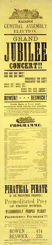 Bowen was directly appointed to cabinet (by way of the Legislative Council) on 16 December 1874, but wary of criticism that a public servant had been awarded political office, he resigned from the Legislative Council[9] and stood for election to the House of Representatives in the 22 January 1875 Kaiapoi by-election, following the resignation of John Studholme on 8 December 1874.[1][10] He was confirmed by the Kaiapoi electorate at general elections in 1875 and 1879 and served until the end of the 7th Parliament in 1881, when he retired.[10] From 1874 to 1877, he was Minister of Justice in five successive ministries (first Vogel Ministry, Pollen Ministry, second Vogel Ministry, first and second Atkinson Ministry).[11] Bowen was responsible for the Education Act 1877, which provided for compulsory free, secular primary education.