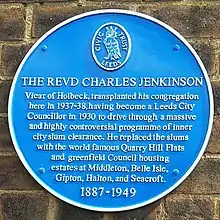 Jenkinson's key interest, for which he sought support by drawing on both Christian ethics and socialist thinking, was housing reform, an area in which the Conservative-dominated Council was not even willing to comply with laws such as the Greenwood Housing Act of 1930. His campaigning included publishing the pamphlet Sentimentality or Common Sense? (supported by the local clergy in June 1931); establishing a Council sub-committee on housing policy; in 1933 publishing a ninety-page minority report called Housing Policy in the City of Leeds in response to what he viewed as an inadequate report by the Council; and being the first chair of the new housing committee in Leeds's Labour council of 1933–35, which took the report as its blueprint for action. Within two years of the formation of the committee, Leeds rehoused 6000 inhabitants of slums, mostly to new green-field estates or new flats at Quarry Hill, Leeds, using an innovative differential rent scheme to help poorer families. Many of Jenkinson's own congregation moved to the new estate of Belle Isle, Leeds. In the face of fierce Conservative opposition, however, he lost his seat in 1936.[1] As people were rehoused, they were required to have their furnishings disinfested of lice by the Council, and the vehicle used for this came to be known as 'Jenkinson's bug van'.[3]