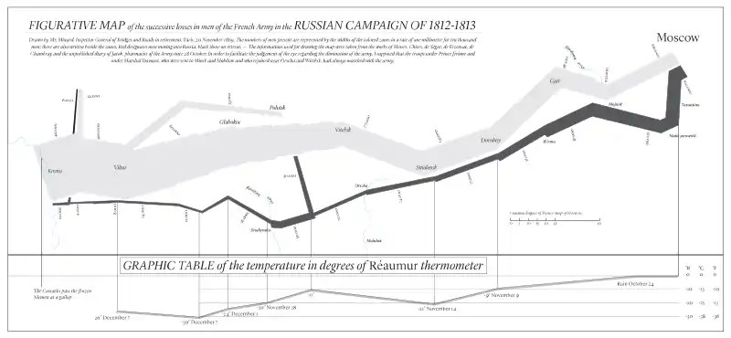 Minard is best known for his cartographic depiction of numerical data on a map of Napoleon's disastrous losses suffered during the Russian campaign of 1812 (in French, Carte figurative des pertes successives en hommes de l'Armée Française dans la campagne de Russie 1812–1813). The illustration depicts Napoleon's army departing the Polish-Russian border. A thick band illustrates the size of his army at specific geographic points during their advance and retreat. It displays six types of data in two dimensions: the number of Napoleon's troops; the distance traveled; temperature; latitude and longitude; direction of travel; and location relative to specific dates without making mention of Napoleon; Minard's interest lay with the travails and sacrifices of the soldiers.[4] This type of band graph for illustration of flows was later called a Sankey diagram, although Matthew Henry Phineas Riall Sankey used this visualisation 30 years later and only for thematic energy flow.