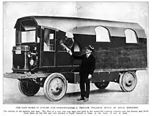 Kellogg proclaimed his love for the Californian wilderness while traveling in his carved redwood log home. He also claimed to be a vegetarian who chose not to own a gun and his outdoor skills included the ability to start a fire with a wooden drill. After discovering an 1867 treatise by John Tyndall that a small and regulated flame could be extinguished by a sound of the appropriate frequency, he claimed to have developed the technique to do this with his voice.[5] He was also a skilled craftsman and an inventor. In 1924 he designed and patented a mechanized fruit and nut picker.[7] He also designed a movable fireplace. Every time he visited his California home, he found that the forests were dwindling and along with his friends who included John Muir and John Burroughs he considered ways to highlight the loss. He "kept thinking and thinking through many years how to take the forest out to the world ...[since] the world could not come out to the forests". After World War I he saw a powerful truck, a Nash Quad and decided to modify it by adding a body made from a 7 metre section of a redwood and carving it out with a bed, a toilet and a kitchen with cupboards. The wood weighed 3 tons and could not be lifted. He then dug a tunnel under the wood and drove the Nash Quad under it and then had the log body lowered onto it. He called his vehicle the "Travel Log" and drove it around at a maximum speed of about 8 km/hour. In later years he traveled in a lighter vehicle that he called the "Bird Wing" - something that he claimed would start when he whistled to it.[5] He traveled at various times to the West Indies and Fiji where he observed a fire-walking ceremony. He also traveled to Paris where he met Auguste Rodin.[8]
