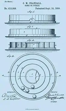 In early 1889 Crandall invented a new game that swept the country simply called "Pigs in Clover". This was among the first or at least the most popular ball-in-a-maze puzzle in America. The "pigs" were marbles and the solver was required to manipulate them in such a manner as to locate each within a set of concentric circles on the puzzle. As the Waverly Free Press reported, "The toy works are turning out eight thousand of 'Pigs in Clover' a day, and are twenty days behind with their orders".[7] It was reported a philanthropist in Kingston ordered enough puzzles for every inmate in the Ulster county jail and the almshouses of the city and county.[8] The popularity of this invention, like many of Crandall's toys, reached beyond the American borders. An article in the Chatham (NY) Republican stated "The English are squealing because our American 'Pigs in Clover' have been introduced at the Court of St. James. They are declaring them not puzzles at all, only Yankee bu[n]kum."[9] American author, Mark Twain mentions the game in his book, The American Claimant.[10]