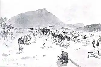 The following illustrations were drawn by Sheldon as War Correspondent for Black and White for Kitchener's campaign for the Anglo-Egyptian conquest of Sudan.[9] The days of the illustrator war correspondent were already numbered. Hodson notes that photography was becoming the dominant art and that this, and the redrawing of war correspondent's sketches to be more dramatic and photography-like was already leading to a falling-off in the quality of illustrations.[10] Black and White was already redrawing some of Sheldon's sketches in this way. By the time of the campaign in Cuba, Sheldon was providing photographs for publication as well as sketches.