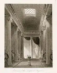 On 14 April 1810 he set off on the Grand Tour.[5] Due to the Napoleonic Wars much of Europe was closed to the British, so he headed for Cadiz, Malta and Constantinople (Istanbul); from there he went to Troy, finally arriving in Athens, Greece by January 1811.[6] In Constantinople he met John Foster (architect) who would accompany him on his tour.[7] In April 1811 he was in Aegina where he helped excavate the Temple of Aphaea (which he called the Temple of Jupiter),[8] finding fallen fragmentary pediment sculptures (these are now in Germany), which he discovered were originally painted.[9] On 18 August 1811 he set out with three companions from Zakynthos on a tour of Morea, aiming for the temple of Apollo Epicurius at Bassae in Arcadia.[10] The magnificent Bassae Frieze that Cockerell discovered at the temple was eventually excavated and sold to the British Museum.[10] His tour continued visiting, Sparta, Argos, Tiryns, Mycenae, Epidaurus and Corinth returning to Athens.[11] It was there that he met Frederick North, who persuaded Cockerell and Foster to accompany him to Egypt,[12] setting off in late 1811, they travelled via Crete, where North abandoned the idea, so Cockerell and Foster decided to visit the Seven churches of Asia and visit Hellenistic sites along the way,[12] the itinerary was: Smyrna, Pergamon, Sardis, Ephesus, Priene and Side.[12] They arrived in Malta on 18 July 1812, where Cockerell was confined to bed for three weeks with a fever. By 28 August 1812 they were in Sicily, where they stayed several months studying the chief Greek temples, drawing a reconstruction of the Temple of the Olympian Zeus, Agrigento.[12] From December 1813 to February 1814 he was in Syracuse, Sicily working on drawings for a projected book on Aegina, Phigalia and the Bassae Frieze, he left to return to Athens where he continued work on the book, only to fall ill again on 22 August, he was still ill on 10 November, when he wrote to his sister.[12] On his recovery he continued his travels, in January 1814 he was in Ioannina, where he had an audience with Ali Pasha.[13] Returning to Athens, before going on in May 1814 to Zakynthos to attend the sale of the Bassae Frieze. Back in Athens he met an old school friend John Spencer Stanhope and his brother, between August and October he was struck down by the fever again, but was well enough to attend a celebration of the anniversary of the Battle of Salamis at Piraeus on 25 October.[13] In December 1814 he returned to the Temple of Aphaea for a fortnight to check and correct his drawings.[14] In a letter of 23 December 1814 he details his re-discovery of entasis, he enclosed a sketch for Robert Smirke of one of the Parthenon columns showing its outline.[15]