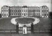 Between 1688 and 1696 the Duke rebuilt Petworth House on a palatial scale. A painting made in about 1700 of his new house was identified by the art historian Sir Anthony Blunt in the collection of the Duke of Rutland at Belvoir Castle.[9] It shows evidence of a French chateau style, with original central dome, now lost. A similar image is included in Laguerre's wall-painting on the Grand Staircase at Petworth.[10] Horace Walpole called it "in the style of the Tuileries". The parapets of the walls are surmounted by urns. On the three sections of the parapet in front of the central dome and the domed roofs of the two projecting wings are placed gesticulating statues. Today the roofline is lower and flat, giving the building a plain appearance, possibly following the fire of 1714 and subsequent repairs. The statues and urns are now lost and the entrance front has been moved to the rear.[11] One of the few elements of the old mansion he retained is the mediaeval chapel, which retains the large early 17th century Percy Window, depicting the coats of arms of several Percy Earls of Northumberland.