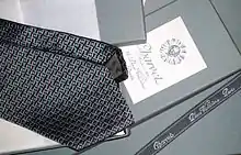 Charvet ties, ranked as the best designer's ties in the US,[227] are handmade,[228] generally from a thick multicolor brocade silk,[229] of a high yarn count,[201] often enhanced by the addition of a hidden color,[230] producing a dense[231] fabric which goes through a proprietary finishing to acquire lustre, fluidity and resilience[209] and achieve the right knot.[201] The company develops its own exclusive patterns and colors. It creates about 8,000 models per year,[232] Jacquard woven on exclusive commission, with silk either alone or mixed with other precious yarns, such as cashmere,[233] camel hair, bamboo yarn or covered with laminated precious metals, such as silver, gold or platinum,[234][235] with techniques dating back to the 14th century when the popes were based in Avignon,[n. 22] which were also used in the 1920s for vests.[235] Further to a long history of brocade patterns, first used in the 19th century for vests and then for ties, Charvet offers, according to Bernhard Roetzel, the largest range of woven silk neckties in the world.[237] The ties collection, sometime "unmistakably bold"[201] or "witty [and] wicked",[238] often noted for its shimmer and changing colors (Charvet ties' shimmer "has become so synonymous with the company that we call it the Charvet effect", says a retailer.[42])[239]