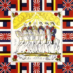 After 1912, with the development of the Art Deco style, Charvet, along with fashion designer Paul Poiret, started to commission art work from the French painter Raoul Dufy,[127] the "granddaddy of modem chic",[128] through the French weaver Bianchini-Férier.[129] Some of the first were related to the war, such as Les Alliés or the Victory Rooster (Figure, left).[130] This was followed by more silk squares, woven silk fabrics for vests,[25] and printed ramie fabrics for dressing gowns and shirts.[131] Some famous customers of the period were fashion designer Coco Chanel[132][n. 14] and the Maharadjah of Patiala who once placed a single order of 86 dozen shirts.[134]