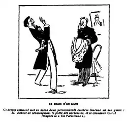 After his 1897 portrait by Giovanni Boldini, Montesquiou's dandyism became famous and made him a frequent subject of caricatures.[64] In 1903, a French satirical magazine illustrated by a caricature from Sem to which Marcel Proust alluded in a letter to Montesquiou,[65] had Montesquiou saying: "Nobody in the world ever saw such things! Pinks, blues, lilacs, in silk, and in cobweb! Charvet is the greatest artist in the Creation."[64] In a letter to Montesquiou, alludes to the caricature by Sem of Montesquiou examining products at Charvet (Figure, right).