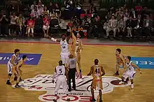 McFarland #13 battles for the jumpball during the bj league final at Ariake Coliseum