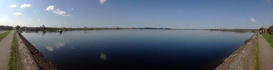 Chasewater is a reservoir located in the parish of Burntwood[2] and the district of Lichfield in Staffordshire, England. Originally known as Norton Pool and Cannock Chase Reservoir, it was created as a canal feeder reservoir in 1797.[3] The reservoir was created to directly supply the Wyrley and Essington Canal and maintain levels in the 160-mile (260 km) Birmingham Canal Network. During a period of great industrial growth in the Black Country region the maintenance of water levels in canal infrastructure was essential and Chasewater was in great demand. As canals became less essential for transport of goods during the mid-20th century, the reservoir diversified and became a popular public amenity with activities such as water-skiing, sailing, wakeboarding and cycling. Chasewater is the third largest reservoir by volume in the county of Staffordshire and the largest canal feeder reservoir in the West Midlands.