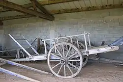 Later, where the quality of the road permitted, the range might be extended by the use of charrettes (carts). When designed for this trade, with a minimum of weight put into their construction and provision for harnessing the four horses, these vehicles took the name of chasse-marée. As speed was essential, they were normally hauled by two pairs of horses rather than the single horse which is normal for a cart. The vehicle took the form of two wheels, of a diameter large enough to minimize the slowing effect of bumps in the road. On their axle was mounted an open rectangular frame within which were slung the baskets holding the fish, packed in seaweed. More baskets were stacked above.[1] The teams of usually fairly small horses were worked hard and changed at posting stations in the same way as those of mail coaches.[2]