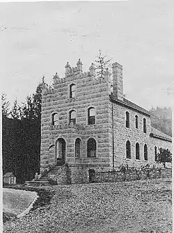 The "chateau" is a four-story residence built in 1906. The National Register nominator termed it an example of "stone church architecture", and asserted it resembles Richardsonian Romanesque architecture. It is north-facing, and is 35 by 80 feet (11 m × 24 m) in plan.[2] Its "most unusual feature is the defensive stepped false front façade including a crenellated parapet composed of crenels and merlons, which appear again above the stone portico below. The parapet obscures the wood shake covered gable roof behind it."[2]