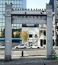 The Kimlau Memorial Arch was erected by the American Legion, Lt. B.R. Kimlau Post 1291 in 1961 to honor United States service members of Chinese ancestry who have fought and died serving their country. The arch is named after 26-year-old 2nd Lt. Benjamin Ralph Kimlau, an aircraft commander in the 380th Bombardment Group who was shot down on a mission over Los Negros Island on March 5, 1944 during World War II.[4] The memorial was designed by Poy G. Lee,[5] and bears calligraphy by noted Chinese calligrapher and poet Yu Youren (于右任). There also is a larger-than-lifesize bronze statue of Lin Zexu in the square sculpted by Li Wei-Si.[2]
