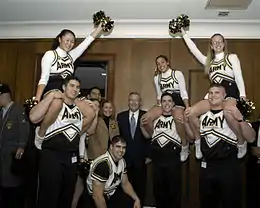 In 1923, at the University of Minnesota, women were permitted to participate in cheerleading.[7][20] However, it took time for other schools to follow. In the late 1920s, many school manuals and newspapers that were published still referred to cheerleaders as "chap," "fellow," and "man".[21] Women cheerleaders were overlooked until the 1940s when collegiate men were drafted for World War II, creating the opportunity for more women to make their way onto sporting event sidelines.[22] As noted by Kieran Scott in Ultimate Cheerleading: "Girls really took over for the first time."[23] An overview written on behalf of cheerleading in 1955 explained that in larger schools, "occasionally boys as well as girls are included,", and in smaller schools, "boys can usually find their place in the athletic program, and cheerleading is likely to remain solely a feminine occupation."[24] During the 1950s, female participation in cheerleading continued to grow and by the 1970s, it was girls primarily cheering at public school games.[25] Cheerleading could be found at almost every school level across the country, even pee wee and youth leagues began to appear.[26][27]