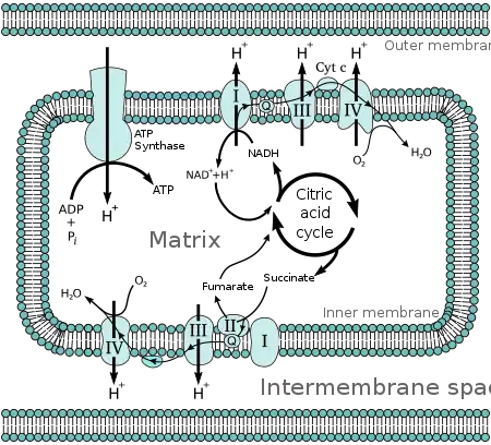 Molecules such as glucose are metabolized to produce acetyl CoA as an energy-rich intermediate. The oxidation of acetyl coenzyme A (acetyl-CoA) in the mitochondrial matrix is coupled to the reduction of a carrier molecule such as nicotinamide adenine dinucleotide (NAD) and flavin adenine dinucleotide (FAD).[2] The carriers pass electrons to the electron transport chain (ETC) in the inner mitochondrial membrane, which in turn pass them to other proteins in the ETC. The energy available in the electrons is used to pump protons from the matrix across the stroma, storing energy in the form of a transmembrane electrochemical gradient. The protons move back across the inner membrane through the enzyme ATP synthase. The flow of protons back into the matrix of the mitochondrion via ATP synthase provides enough energy for ADP to combine with inorganic phosphate to form ATP. The electrons and protons at the last pump in the ETC are taken up by oxygen to form water.