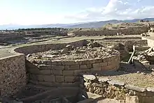 A work, residential and administrative warehouse was necessary for the centrally organized marble demolition, built on an area of over 40,000 square meters on the northern edge of the quarry, 800 meters from the Roman city.[6][7] In the huge warehouse area, there was a cemetery for the campers (the urban necropolis was located on the southern slope of the Djebel Chemtou), which housed stalls, workshops, bathhouses, sanctuaries, water distributors and, just in front of the 300-meter-long south wall. This often involved judges who were condemned to the quarries, e.g. Christians persecuted after the turn of the century (including women). They were buried in simple Steingrräberiden with modest grave mounds. The storage area was surrounded by a high, heavy wall, with only two gate entrances so far. Although the work camp was so hermetically separated from the city, it took advantage of it: chiefs of the quarries donated the town public buildings, but not of marble blocks, which were too expensive and destined for export. The largest building in the camp was a factory site or fabrica, more than 3,000 square meters, which was demarcated by the camp itself through heavy walls. It was divided into six elongated workshop axes, which could only be entered individually through six lockable gates and were not connected together. More than 5000 stone objects of different kinds were found here, which testify to a regular mass production: besides plates and blocks of marble blanks, plates, pots, marquetry, mortars, pestles, relief plates and statuettes were produced here for everyday use as well as for export. Some of the ground shells had walls of only 2 millimeters in thickness.[8] The complex was built in the penultimate third of the 2nd century AD, and was not built until the turn of the century with its own water supply system inside. Already around the middle of the 3rd century, however, an earthquake vault and flat roofs of the multi-nave system collapsed. Thereupon the Fabrica was only repaired in parts, and remained under obscure conditions until the end of the century. It is probable that the workers in this last phase were no longer living in the camp, as no new graves were being built at the camp cemetery. In the fourth century the warehouses were systematically plundered for building material and finally the camp was completely planned.[9]