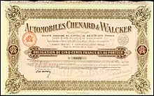 | Founded | 19 January 1899 Registered 1900 as Chenard, Walcker et Compagnie Registered 1906 as Société Anonyme des Anciens Étabissements Chenard et Walcker |