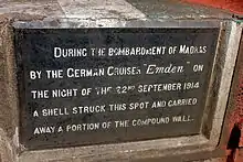 By the late 18th century, most of the southern region of India had been conquered by the British and Madras was established as the capital of the Madras Presidency.[21] During this period, the port flourished under the British rule, becoming an important naval base and urban center. A port at Madras was first suggested by Warren Hastings in 1770 when he was posted here, who later became the first Governor General of India.[8][22] However, it was not until the 1850s that work began on a pier to berth vessels following suggestions from the Madras Chamber of Commerce and Industry. Till 1815, it was an open roadstead and exposed sandy coast, swept by occasional storms and monsoons. At the time, the natural harbour was so shallow that ships had to anchor over 1 km (0.62 mi) offshore, and cargo was delivered to and from the shore in masula boats[23][24] and catamarans.[25] Cargo losses were high, close to 90 percent, in addition to pilfering with several goods from the ships often taken to the nearby evening bazaar.[8] A 335 m (1,099 ft) iron-screw pile pier capable of berthing larger vessels was built perpendicular to the shore in 1861.[26] However, the storms of 1868 and 1872 made the initial piers inoperative. In 1875, Edward VII laid the foundation stone for a new port,[8] and the masonry work for L-shaped breakwaters was started in 1876. The northern and southern groynes of the harbour were constructed, to create a still water enclosure that would be unaffected by storm and surf water. However, the groynes collapsed in 1877. The same year, construction of the south pier was commenced with concrete blocks weighing 33 tonnes each brought from Pallavaram,[8] and the port started handling ships inside the harbour from 1881. However, again the storm of 12 November 1881 completely washed the almost-completed harbour, breaching over half a mile of breakwater.[26] An artificial harbour was then built and the operations were started in 1881, and the pier was rebuilt in 1885, although there was a demand for relocating the entrance. Work on the harbour was completed in 1911.[22] The Chennai Port Trust has taken the year 1881, the year of rebuilding, as the starting year. The cargo operations were carried out on the northern pier, located on the northeastern side of Fort St. George in Chennai. In the first couple of years the port registered traffic of 300,000 tonnes of cargo handling 600 ships. The first railway line in South India was laid between Madras and Arcot which started operating in 1856. By the late 19th century, the port was well connected to the other two important cities in the British colony, viz. Bombay (Mumbai) and Calcutta (Kolkata).[27] In 1904, a new northeastern entrance was added to control siltation in the basin, after closing the original eastern entrance. The port's quays (berths) were constructed at different periods—the South Quay I in 1913, the five west quay berths between 1916 and 1920, the north quay in 1931 and the South Quay II in 1936, in the Inner Harbour, later christened Dr. Ambedkar Dock.[26] Chennai was the only Indian city to be attacked by the Central Powers during World War I[28] when a German cruiser, SMS Emden, shelled the oil depot within the port belonging to the Burmah Oil Company and raided vessels in 1914 disrupting trade, resulting in the death of at least 5 sailors.[8] Other than Calcutta, which was practically taken over by the American army,[29] Chennai port was the only other operational one in eastern waters during the Second World War.[25] In 1911, the Royal Madras Yacht Club (RMYC), which is based within the Chennai Port premises, was founded by Sir Francis Joseph Edward Spring, the first chairman on the Madras Port Trust who was responsible for Chennai becoming a trading hub, especially during World War II.[22][25] In 1916, the harbour office building was constructed.[26]