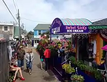 - The central business district, or Town, from Holly Walk to Doctor's Walk, and the beach to the bay, includes the Fire House, Community Center/Arts Project, Grove Hotel, a clinic, and the public ferry dock, as well as a few cooperatives, bars, grocery stores, art galleries, realtors, and restaurants. It is more densely settled than the rest of the hamlet. Several major structures in the center were "destroyed" by a large fire in March 2015, including the Grove Hotel (since rebuilt) and Holly House.[13]