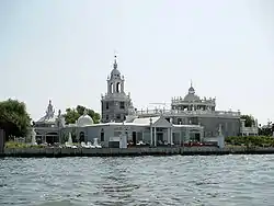 In the 1950s, Cherry Grove became a "safe haven" or "LGBTQ mecca", one of three that included Provincetown and Key West, where they "could only fleetingly enjoy a carefree, 24-hour-a-day queer life by running off to a handful of destinations comfortably removed from a homophobic America."[6] Only 60 miles from New York City, it was isolated because of its location off Long Island that required access by a ferry or, at the time, sea plane.[6] The gay aura of the town supposedly arose when Christopher Isherwood and W. H. Auden arrived dressed as Dionysus and Ganymede, carried aloft on a gilded litter by a group of singing followers.[7] The hamlet's major hotel and lounge in the 1950s was Duffy’s, which burned on September 27, 1956, and was replaced by the Ice Palace Hotel.[8] John Eberhardt, a developer who died in 2014, was credited for building the Belvedere Hotel and many other properties in the hamlet, from 1956 to the 1970s.
