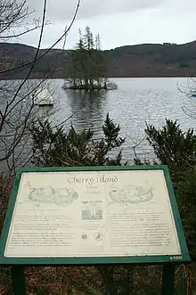 Cherry Island (Scottish Gaelic: Eilean Muireach, meaning Murdoch's Island) is the only island in Loch Ness, Highland, Scotland, and is an example of a crannog.[1] The island is about 150 yards (140 m) from the shore near the southern end of the loch. The island was originally 160 feet (49 m) by 168 feet (51 m) across, but is now smaller as the level of the loch was raised when it became part of the Caledonian Canal.[1] The increase in the level of the loch caused a smaller natural island nearby Eilean Nan Con[2] (also known in its Anglicised form of "Dog Island"), to be totally submerged.