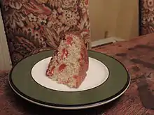 Cherry cake is a traditional British cake. The cake consists of glacé cherries evenly suspended within a Madeira sponge.[1] Glacé cherries are used because the moisture within fresh cherries causes them to sink to the bottom of any cake, ruining the cake's form. The cherries are usually halved or quartered, then washed and floured to help prevent sinking.[2]