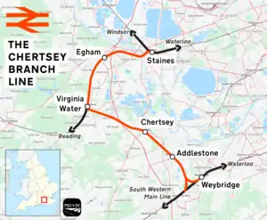 The Chertsey branch line, opened in 1848, connects the Waterloo to Reading Line at Virginia Water to the South Western Main Line at Weybridge. It is also referred to as the Weybridge branch line, or by its more accurate description since 1866, the Chertsey loop. For passenger services it has a terminus siding at Weybridge otherwise its other three stations are through stations and serve the modest-population settlements Chertsey, Addlestone and Virginia Water. Day trip steam excursions share in use of the line sometimes calling at London Waterloo, Staines, Woking and stations and others before Salisbury, Yeovil, Dorchester and/or Bath towards the far south-west of the country.