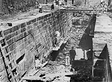 The project was halted when the United States entered World War II and resources were needed elsewhere. In 1941, Harry Athey suggested to President Franklin Roosevelt that the canal could be converted into an underground highway or a bomb shelter with its roof for landing airplanes. The whole idea was deemed impractical due to the river's periodic flooding.[13] In 1942, freshets destroyed the rewatered sections of the canal. National Park Service (NPS) official Arthur E. Demaray pressed that the canal from Dam #1 be restored, to supply water to the Dalecarlia Reservoir in case sabotage or bombing destroyed the normal conduits of water. Since this transformed the canal into a concern of national security, in 1942, the War Production Board approved the work.[14] By 1943, Congress had funded the work, repairs were done, and the Park Service resumed boat trips in October 1943.[15]