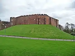 During the Civil War Chester was held by the Royalists.[1] The castle was assaulted by Parliamentary forces in July 1643, and in January and April 1645.[6] Together with the rest of the city, it was besieged between September 1645 and February 1646.[1] Following the civil war the castle was used as a prison, a court and a tax office.[3] In 1687 James II attended Mass in the chapel of St Mary de Castro.[4] In 1696 Chester mint was established and was managed by Edmund Halley in a building adjacent to the Half Moon tower.[3] During the 1745 Jacobite rising a gun emplacement was built on the wall overlooking the river.[1]