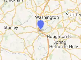 Chester New Bridge is a Grade II* listed[1] medieval stone bridge over the River Wear near Chester-le-Street in County Durham, England. It carries Black Drive, the private entrance road to Lambton Castle, across the Wear just north of the A1052 road bridge, which superseded it in 1926. Frank Graham in Bridges of Northumberland and Durham describes it as "a fine 14th century bridge"[3] but the official English Heritage listing citation considers it to be "probably C15". The parapet, which English Heritage suggest may be partly rebuilt,[4] bears a worn inscription referring to "Charles Swinburne's Leap", an incident in which a horse and its rider were killed falling from the bridge.[3] The bridge has a span of approximately 45 metres (148 ft) and four pointed arches with cutwaters on each pier. An archway at its eastern end, erected in 1815 by Ignatius Bonomi, marks the entrance to the Lambton Estate.[5]