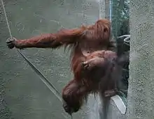 Realm of the Red Ape is a £3.5 million extension to the existing orangutan house, home to Bornean orangutans, and was the most expensive capital project in the zoo's history before the construction of Islands.[35] The exhibit opened to the public on 26 May 2007 after a two-year construction period. It comprises a new two-story building linked to the existing orangutan house with three indoor and two outdoor enclosures, providing accommodation for a larger number of apes. The outdoor areas can be viewed from a first floor public gallery and feature mesh roofs supported by tree-like structures which act as climbing frames for the apes. A male Sumatran orangutan was born at the zoo in November 2019.[36] A further enclosure houses a group of lar gibbons.
