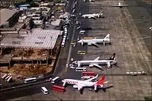 RAF Santacruz was constructed in the 1930s.[19] It was a bigger airfield than nearby Juhu Aerodrome and was home to several RAF squadrons during World War II from 1942 to 1947.[20] The Airport covered an area of about 1,500 acres (610 ha) and initially had three runways.[21] The apron existed on the south side of runway 09/27, and the area, referred to today as the "Old Airport", houses, among others, maintenance hangars of Air India, Air Works India, Indamer Aviation Pvt Ltd. and MIAL's General Aviation Terminal.