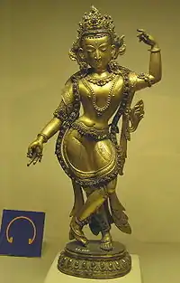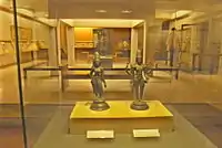 Sculptures and coins transferred from the Poona Museum in Pune and the collections of the Bombay branch of the Royal Asiatic Society resulted in the development of an archaeological section, with precious sculptures and epigrams.[9] The Indus Valley Culture Gallery houses fishing hooks, weapons, ornaments and weights and measures from the Indus Valley Civilization (2600–1900 BCE).[12] Artefacts from the excavation of the Buddhist stupa of Mirpurkhas, were housed in the Museum in 1919.[1] The sculpture collection holds Gupta (280 to 550 CE) terracotta figures from Mirpurkhas in Sind of the early 5th century, artefacts dating to the Chalukyan era (6th-12th century, Badami Chalukyas and Western Chalukyas), and sculptures of the Rashtrakuta period (753 – 982 CE) from Elephanta, near Mumbai.[9]