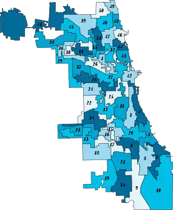 The most recent city council election was the 2019 Chicago aldermanic elections.[4] The current term began on May 20, 2019.[5]